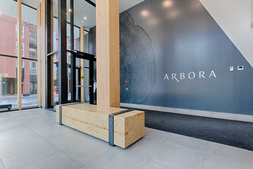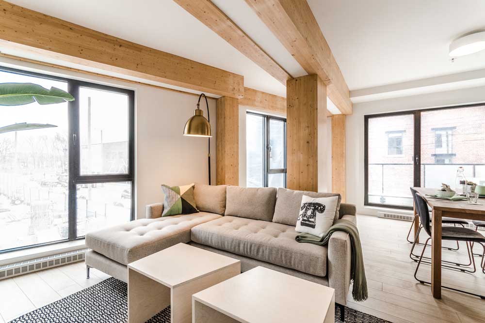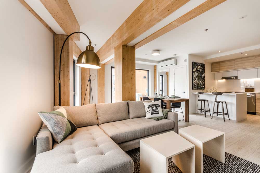 Il s’agit du plus grand projet résidentiel en bois CLT (lamellé-croisé) au monde et le premier bâtiment de plus de six étages au Québec à laisser sa structure en bois massif lamellé-collé apparente à l’intérieur des logements, un matériel reconnu pour sa performance et sa robustesse.